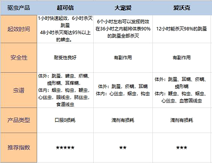 綜上,超可信的起效時間最快,對于狗狗驅蟲的殺滅率高,蟲子不容易出現反復的情況。而大寵愛和愛沃克起效沒有超可信快,而且對于跳蚤等繁殖快的蟲子無法徹底消滅。