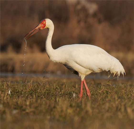 白鶴(學(xué)名:Grus leucogeranus,英文名:Siberian Crane)屬。別名西伯利亞鶴、黑袖鶴。大型涉禽。全長約130厘米。體羽除小翼羽、初級覆羽和初級飛羽為黑色外,為純白色。頭和臉部裸出部分為鮮紅色。嘴赭紅色。腳淺肉紅色。棲息于蘆葦沼澤濕地。大型涉禽,體長120~160厘米。頸、腳較長,通體大多白色,頭頂鮮紅色,喉和頸黑色,耳至頭枕白色,腳黑色,站立時頸、尾部飛羽和腳黑色,頭頂紅色,其余全為白色。