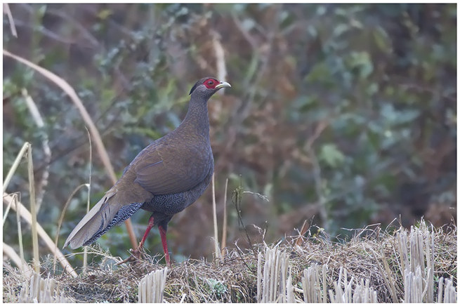 雌鳥:上體棕褐色或橄欖褐色;羽冠褐色,先端黑褐色;臉裸出部小,赤紅色。背羽干較淡,邊緣較深,飛羽棕褐色,次級飛羽外翈綴有黑色斑點;中央尾羽棕褐色,外側尾羽黑褐色,滿布以白色波狀斑。下體亦為棕褐或橄欖褐色,胸以后微綴黑色蟲蠹狀斑,尾下覆羽黑褐色而具白斑。