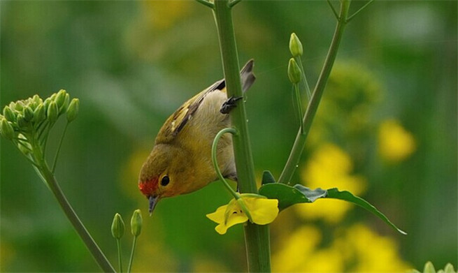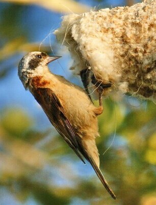 攀雀的產卵季節從4月上旬至6月中旬,雄性攀雀異常的興奮,高唱著“愛情進行曲”往返,每一次銜著一嘴的毛來到巢枝,圍繞著枝子轉圈,將嘴中含著的羊毛裹纏在枝子上。攀雀是攀禽,自有高超的攀緣技巧,它將這項表演性的技巧的實用性發揮到了登峰造極,在自己的筑巢時應用得嫻熟快捷,像雜技或者體操表演,眨眼功夫它就在枝子上轉了好幾圈子將銜來的羊毛緊緊地纏裹在樹枝上,而后在纏繞的粗粗的兩根樹杈間依稀拉起絲絲縷縷的纖維,然后繼續在樹枝上“翻單杠”纏繞,兩根樹枝間絲絲縷縷的纖維慢慢擴展為一條“鋼索”。巢織成后就像一個小籮筐。通常每巢產4枚藍色或暗綠色的卵。孵化期不詳。雛鳥是由父母雙方共同喂養,雌鳥單獨維護并保持巢的整潔。
